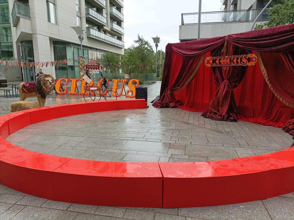 Our circus ring stage is 20ft round joined up or can be spread out to create a larger space. It can also be configured for a smaller space 10ft x 15ft.